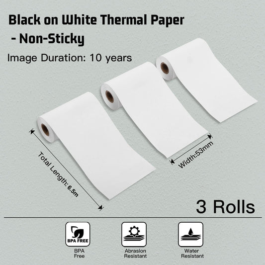 Memoking T02/M02X/M02L White Thermal Paper-10-Year Non-Sticky 53mmx6.5m for Journal Photo Texts Study Notes and More, 3 Rolls