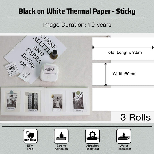 Memoking T02/M02X/M02L White Thermal Paper - 10 Years Sticky 50mm x 3.5m for Journal Photo Texts, Study Notes & More, 3 Rolls