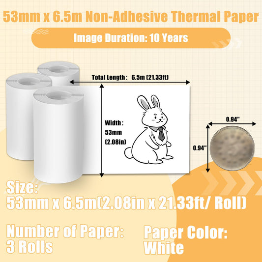 White Thermal Paper, Non-Sticky M02 Paper for T02 M02 M02S M02Pro M03 M04AS Mini Printer, 53mm x 6.5m/Roll, 3 Rolls, Memoking Paper Compatible with Phomemo Printer Paper, Keep for 10 Years