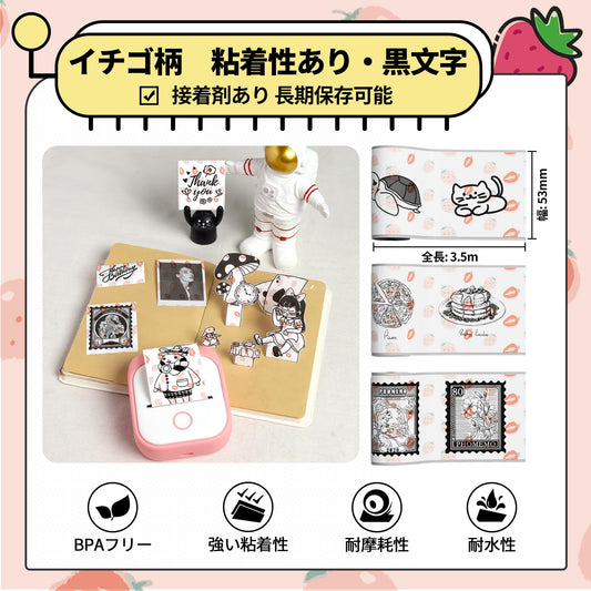 感熱ロール紙 Memoking Phomemo T02対応 純正 シール T02専用感熱紙 50mm*3.5m 3個 ノーカットロールペーパー ラベルシール 強粘着 再剥離 イチゴ柄 黒文字 T02 モバイルプリンター用 シール 印刷用紙 ノード/勉強/メモ/仕事/手帳/落書き/ラベル/オフィス/教育/整理収納に適用