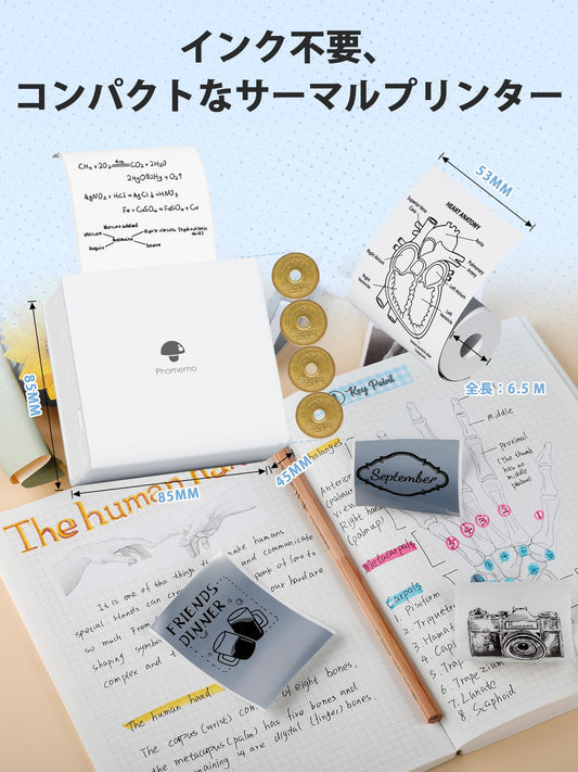 サーマルプリンター M02 ミニプリンター スマホ対応 モバイルプリンター 感熱プリンター Memoking メモプリンター コンパクトプリンター フォトプリンター Bluetooth接続 学習ノート/はがき/写真アルバム/手帳/メモ/買い物リストに使用 専用アプリ 日本語対応 3本ロール状の感熱紙が付属 フォメモ ホワイト