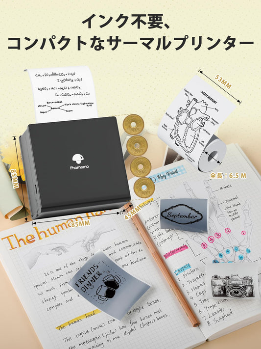 サーマルプリンター M02 ミニプリンター スマホ対応 Memoking モバイルプリンター 感熱プリンター メモプリンター コンパクトプリンター フォトプリンター Bluetooth接続 学習ノート/はがき/写真アルバム/手帳/メモ/買い物リストに使用 専用アプリ 日本語対応 3本ロール状の感熱紙が付属 フォメモ ブラック
