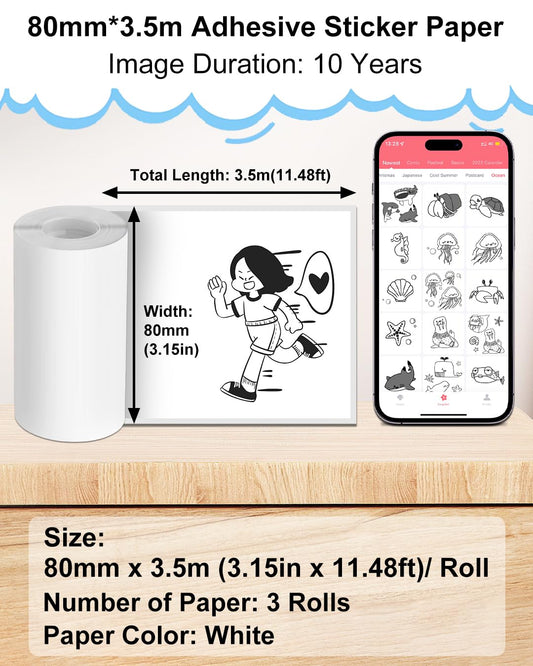 HD 80MM White Sticker Paper for M03 M03AS M04 Printer Paper, Black on White Thermal Paper, Memoking M03AS Paper Compatible with Phomemo Printer Paper M03-80mmx3.5m/Roll, 3 Rolls