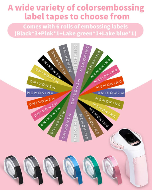 Embossing Label Maker-Memoking E975 3D Embossed Label Maker with 6 Rolls Embossing Tape, Handheld Embosser Sticker Maker, Portable Lettering Labelling Machine for Home, DIY Crafting (Pink)
