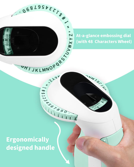 Memoking Embossed Label Maker Machine-E975 3D Label Maker Machine with 6 Rolls of 3/8''(9mm) Label, Handheld Embosser Labelling Machine, Lettering Embossing Label Maker for Home, Office and DIY (Green)