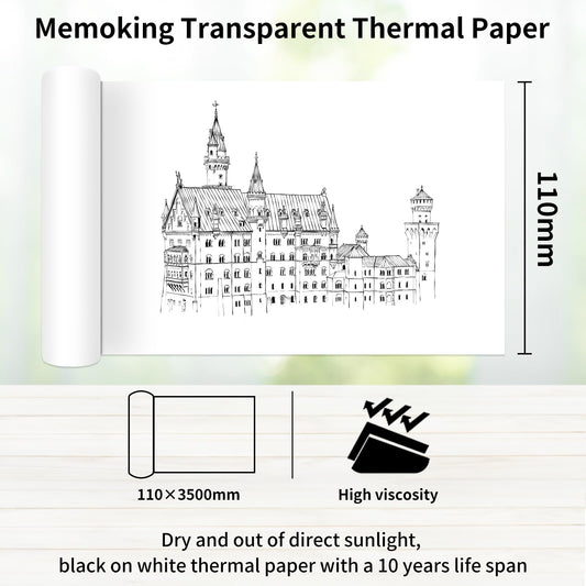 Memoking Biały, samoprzylepny papier termiczny, odporny na olej i wodę, 110 mm x 3500 mm, do drukarek M04S/M04AS i drukarki termicznej M833/M832/M834/M835, papier termiczny trwały, 10 lat, 3 rolki