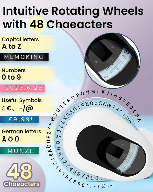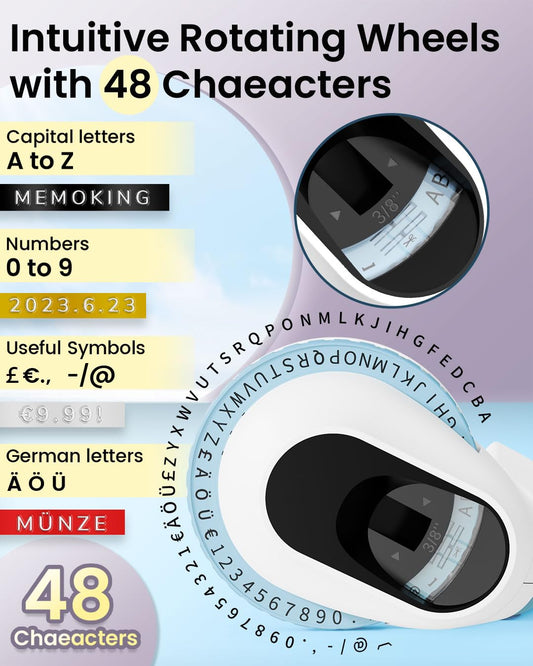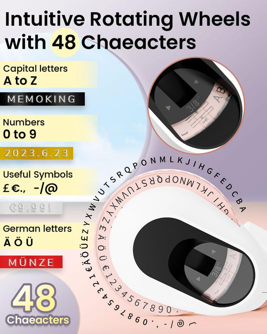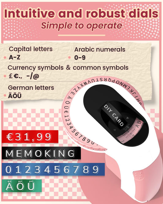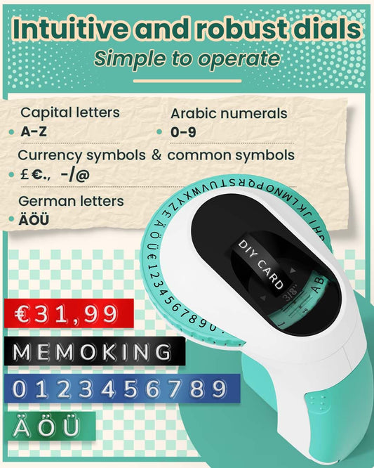 Memoking Beschriftungsgerät - 3D Prägegerät E975 mit 6 Rollen Prägegerät Etiketten, Handgerät Etikettiergerät mit Prägung, Tragbare Beschriftungsgerät Prägegerät für Organisation, DIY (£/€, Ä, Ö, Ü)