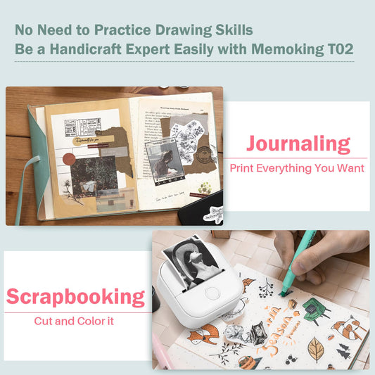 Memoking T02 Mini Imprimante - Noir et Blanc Mini Imprimante Photo Instantanée Portable Bluetooth pour Journal Diary Creation Gift Enfants, Compatible avec iOS et Android, Blanc