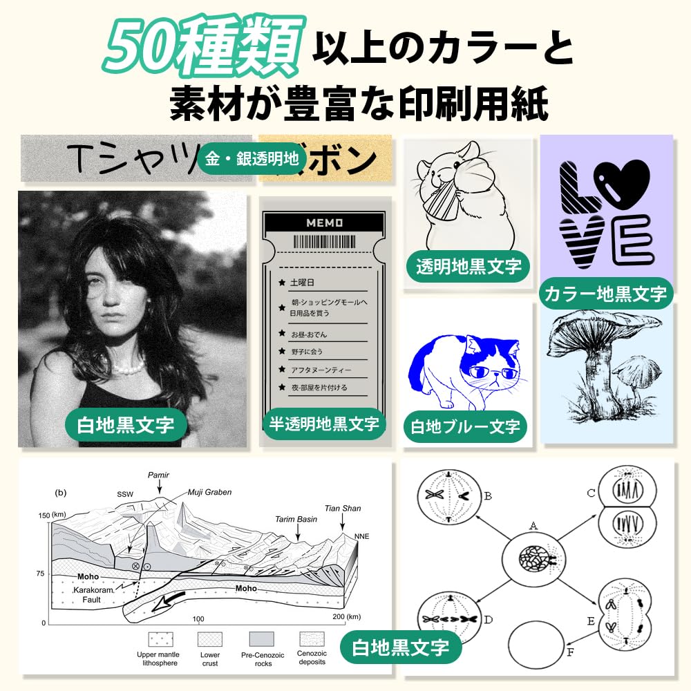 - [多様な用途] M04ASサーマルプリンターは,15,53,80,110 mmのサイズで印刷することができ,ラベル,名札,文書,学習ノート,写真,日記,スクラップブックなど,学校や家庭,オフィスの整理や保管に適した印刷をサポートしています.15 mmのサイズは,倉庫やオフィスなどの家庭内での整理整頓や名前付け,さまざまな場面で使用することができます.80 mmと110 mmのサイズは,豊富な文書やリスト,学習ノートの印刷に特に適しており,効率的に勉強したい学生にもおすすめです