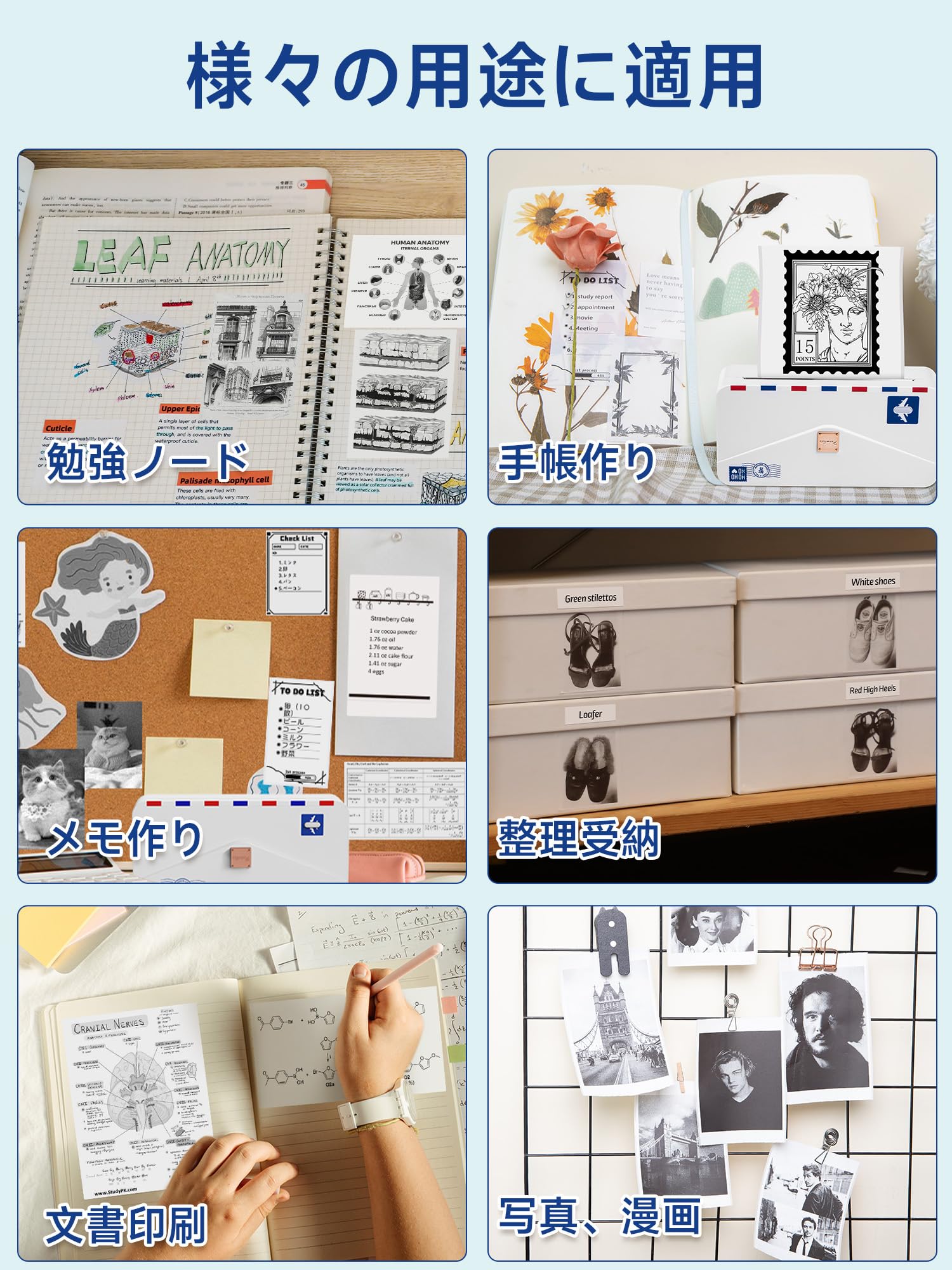- [多様な用途] M04ASサーマルプリンターは,15,53,80,110 mmのサイズで印刷することができ,ラベル,名札,文書,学習ノート,写真,日記,スクラップブックなど,学校や家庭,オフィスの整理や保管に適した印刷をサポートしています.15 mmのサイズは,倉庫やオフィスなどの家庭内での整理整頓や名前付け,さまざまな場面で使用することができます.80 mmと110 mmのサイズは,豊富な文書やリスト,学習ノートの印刷に特に適しており,効率的に勉強したい学生にもおすすめです