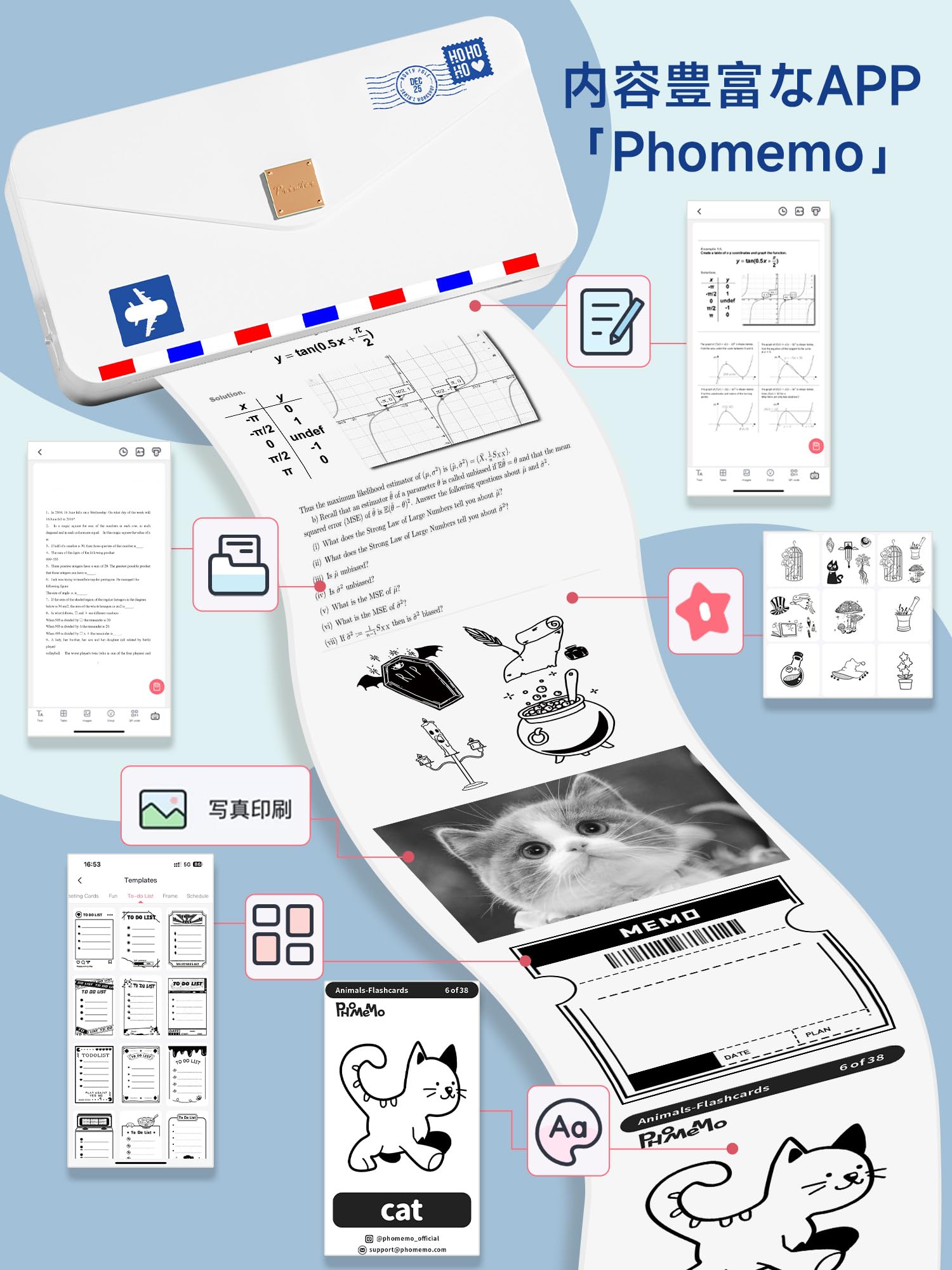 - [封筒デザイン] 2023年,創造的なギフトとしてM04ASミニプリンターが登場します.キュートでスタイリッシュな封筒デザインは,さまざまな年齢層のユーザーに愛され,大切な人への「手紙」のような感覚を与えてくれます.M04ASモバイルプリンターは,ホームやオフィス,学校で使用するのに最適です.学生や会社員,カップル,友人や家族への誕生日や入学,クリスマスなどの特別なイベントの理想的なプレゼントとしてもピッタリです