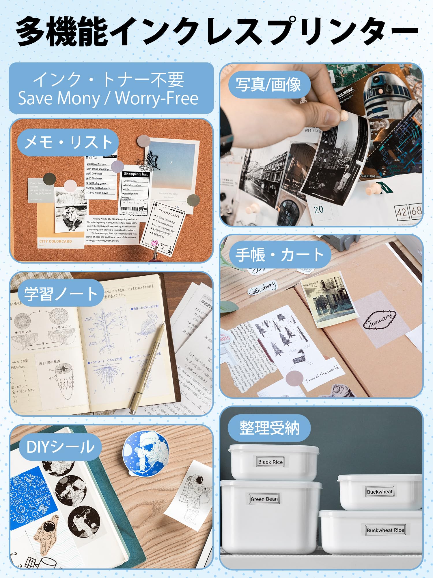 - [利便性] M02モバイルプリンターは,インクやトナーを必要とせず,バッテリーの交換も必要なく,環境に優しく,お金を節約することができます.また,M02の重さは190 gで,サイズは「86 * 82 * 42 mm」で,コンパクトで持ち運びに便利な使い勝手の良いです.いつでもどこでも簡単に印刷することができます.パッケージには53 mmの白地シール*1巻・半透明シール*1巻・透明シール*1巻が含まれていますので,すぐに無限のプリントクリエーションを楽しむことができます