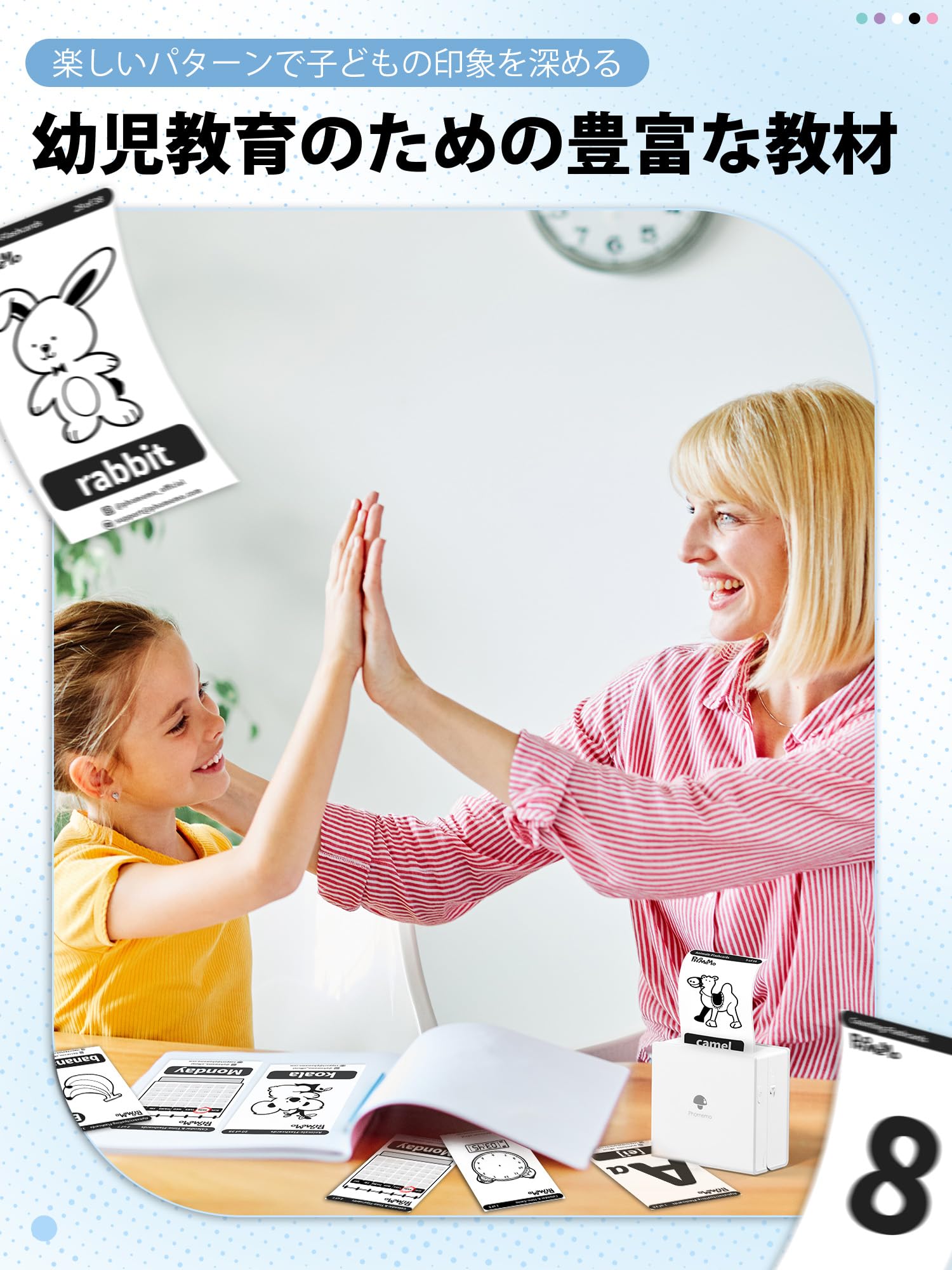 - [勉強効率の向上] M02ミニプリンターを使って勉強を楽しめましょう!写真やスキャンしたデータから必要な情報をすぐにメモとして印刷可能です.これにより,学習や仕事に関連する情報を手元に持つことができ,メモを印刷して目に留めることで,素早くアクセスすることができます.新しい機能「幼児教育」も搭載されており百科事典,カレンダー,単語,動物紹介,パズルゲームなどのカードテンプレートがも利用可能ですので,親子で一緒に学びながら楽しむことができます
