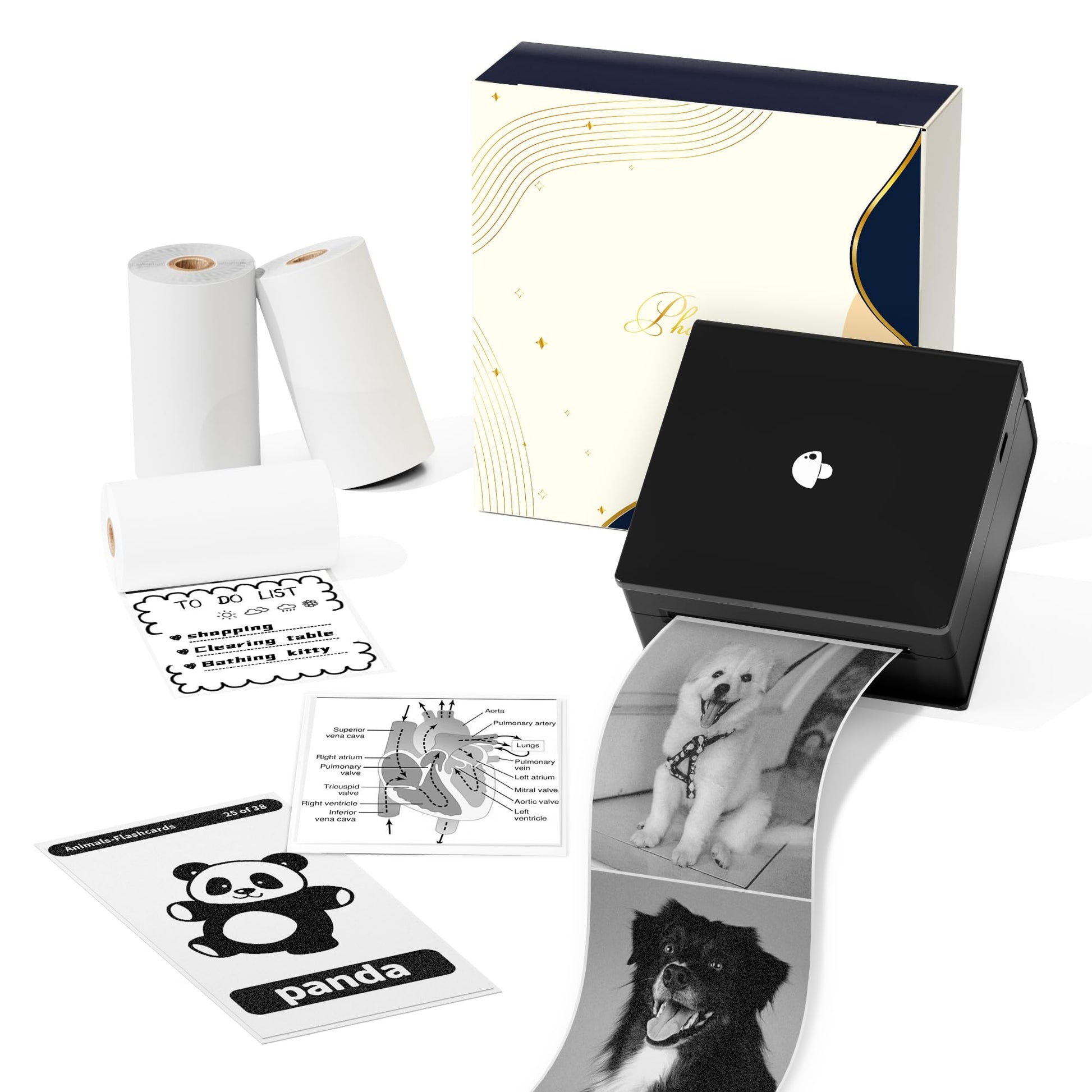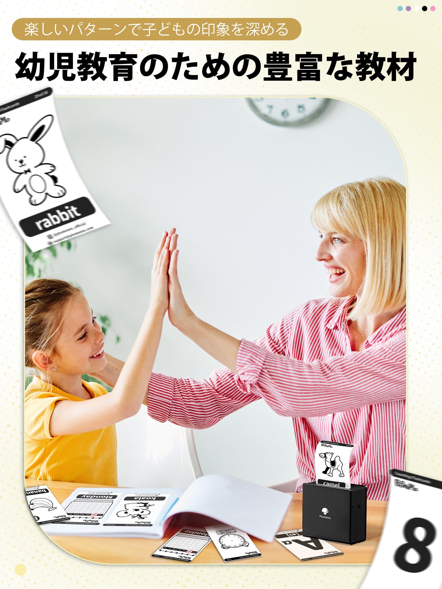 - [勉強効率の向上] M02ミニプリンターを使って勉強を楽しめましょう!写真やスキャンしたデータから必要な情報をすぐにメモとして印刷可能です.これにより,学習や仕事に関連する情報を手元に持つことができ,メモを印刷して目に留めることで,素早くアクセスすることができます.新しい機能「幼児教育」も搭載されており百科事典,カレンダー,単語,動物紹介,パズルゲームなどのカードテンプレートがも利用可能ですので,親子で一緒に学びながら楽しむことができます