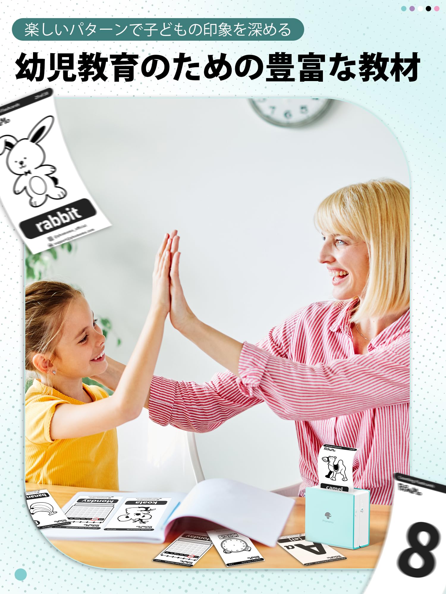 - [勉強効率の向上] M02ミニプリンターを使って勉強を楽しめましょう!写真やスキャンしたデータから必要な情報をすぐにメモとして印刷可能です.これにより,学習や仕事に関連する情報を手元に持つことができ,メモを印刷して目に留めることで,素早くアクセスすることができます.新しい機能「幼児教育」も搭載されており百科事典,カレンダー,単語,動物紹介,パズルゲームなどのカードテンプレートがも利用可能ですので,親子で一緒に学びながら楽しむことができます