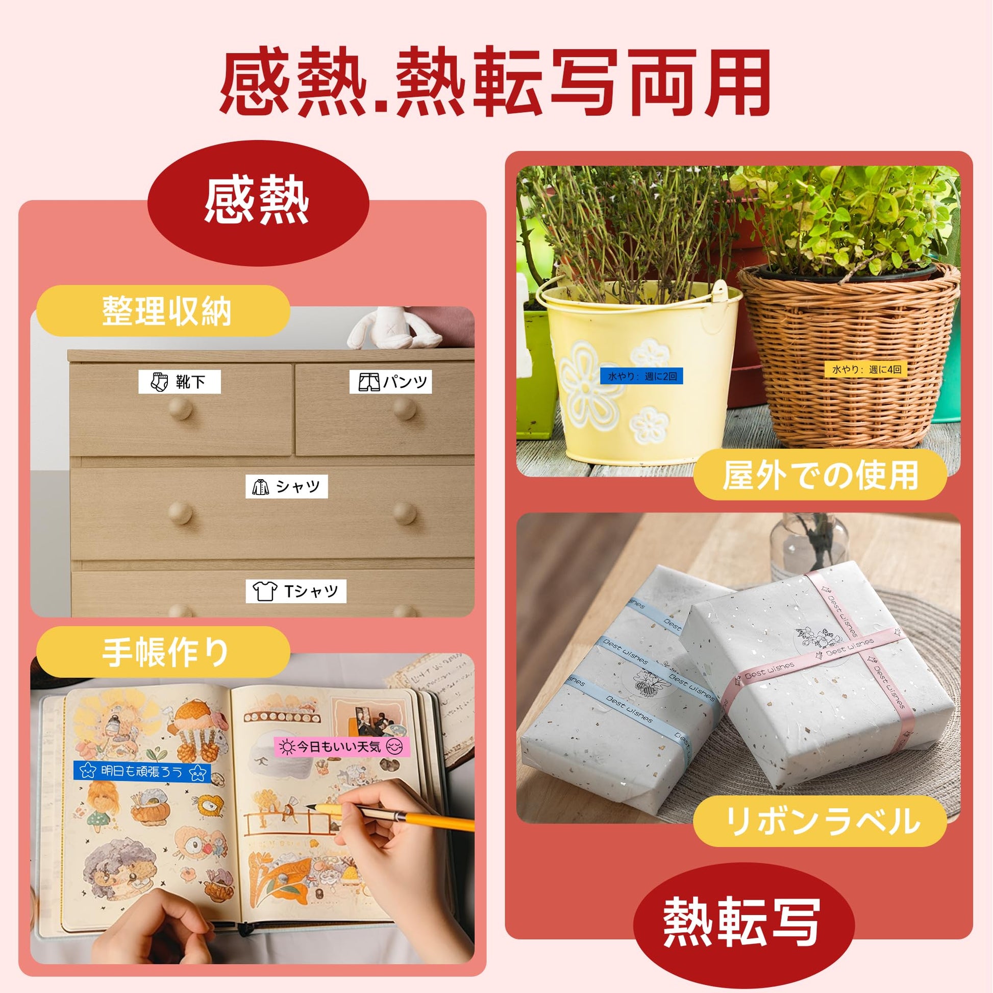 - [幅広い用途] このシールプリンターは,手帳作りや値札作り,宛名書きなどさまざまな場面で役立ち,整理整頓にも一役買います.感熱,熱転写両用のため,専用の熱転写ラベルを使用すれば,屋外での長期保存にも適しています.ご注意:感熱ラベルを使用する場合は,光や高温を避けて保存してください
