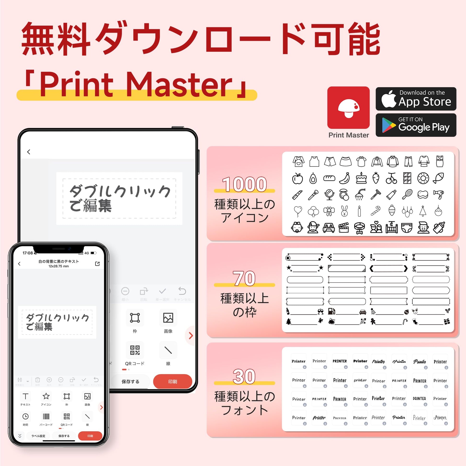 - [使いやすいアプリ] 当社の開発したアプリ『Print Master』は,使いやすくて,機械音痴の方でも簡単に操作できます.『Print Master』には,1000種類以上のアイコン,30種類以上のフォント,70種類以上のフレームが用意されており,入力したテキストや絵文字をフレームと組み合わせるだけで,スムーズに印刷することができます.App StoreとGoogle Playの両方から無料でダウンロードすることができますので,スマホ/タブレット両方利用可能です