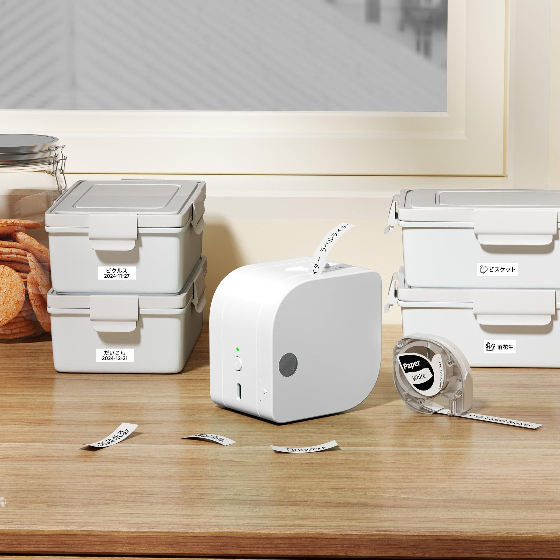 • [便利な使い方] ケーブルは不要で,Bluetoothを介してアプリに接続するだけで印刷内容を作成できます.カッター内蔵の構造により,印刷量に合わせて長さを調整できます!また,テープには中央に切れ目があり,とても簡単に剥がすことができます.お試しラベルが一つ含まれていますので,すぐに無限のプリントクリエーションを楽しめます