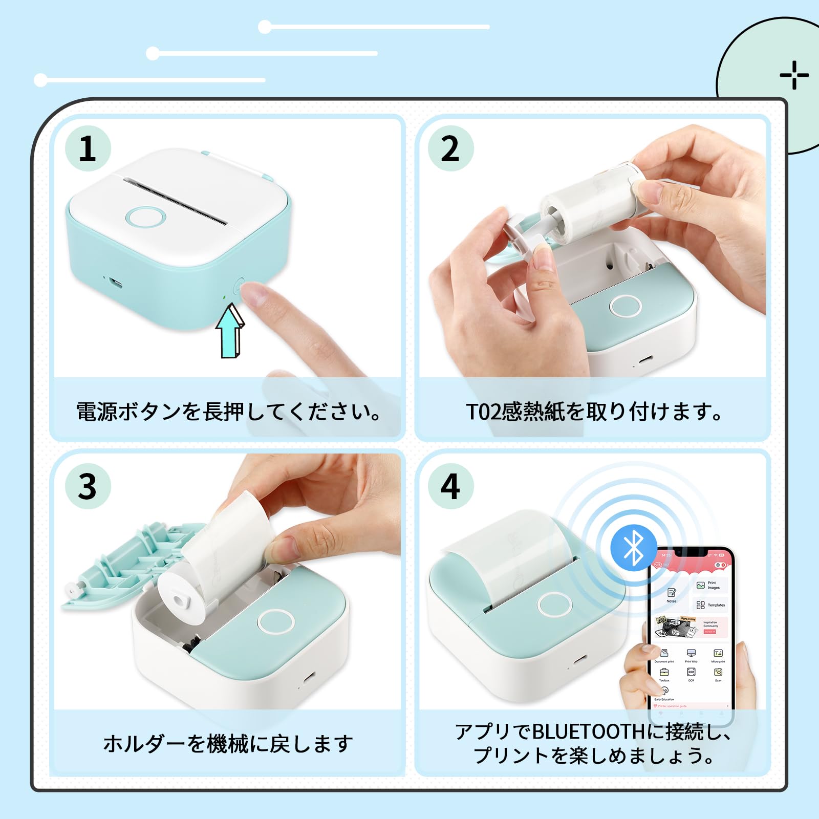 - [T02 ミニプリンター用紙仕様] カラー:ホワイト(白地).文字色:青.粘着性:あり.幅:53 mm,全長:3.5 m.ロール数:3本.画像持続期間:5年「直射日光や多湿な環境を避け,印刷物には頻繁に触れないようにしてください.」