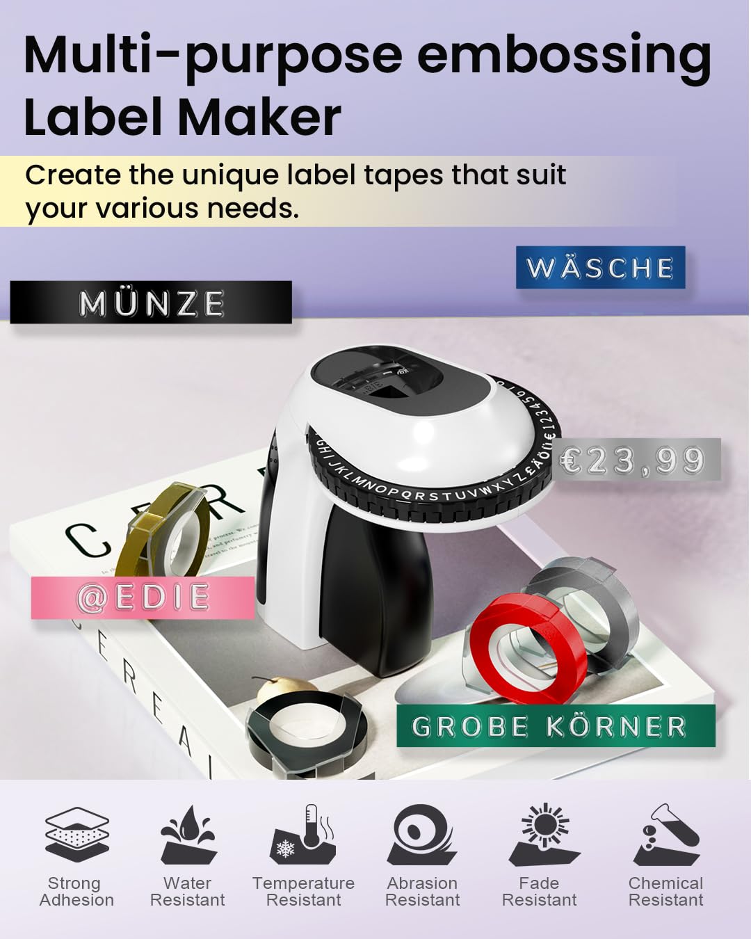 - Der beschriftungsgerät prägegerät wird mit 6 Rollen strapazierfähigem 3D-Präge-Etikettenband geliefert (3 Schwarz/1 Rot/1 Gold/1 Silber), das wasserdicht, ölbeständig, abriebfest, hochtemperaturbeständig, tiefkältebeständig und nicht verblassend ist. Es hat eine gute Haftung und selbst wenn es draußen in der Sonne und im Regen klebt, verblasst oder bewegt sich das Etikett nicht