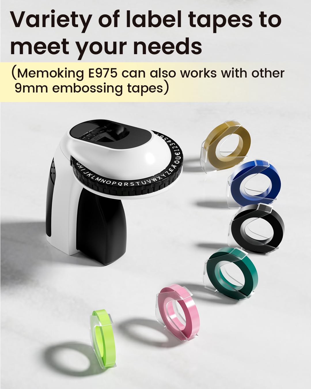 Memoking Beschriftungsgerät Prägegerät - 3D Etikettiergerät E975 mit 6 Rollen Prägegerät Etiketten, Handgerät Beschriftungsgerät mit Prägung, Tragbare Etikettenprägegerät für Haus, DIY (£/€, Ä, Ö, Ü)