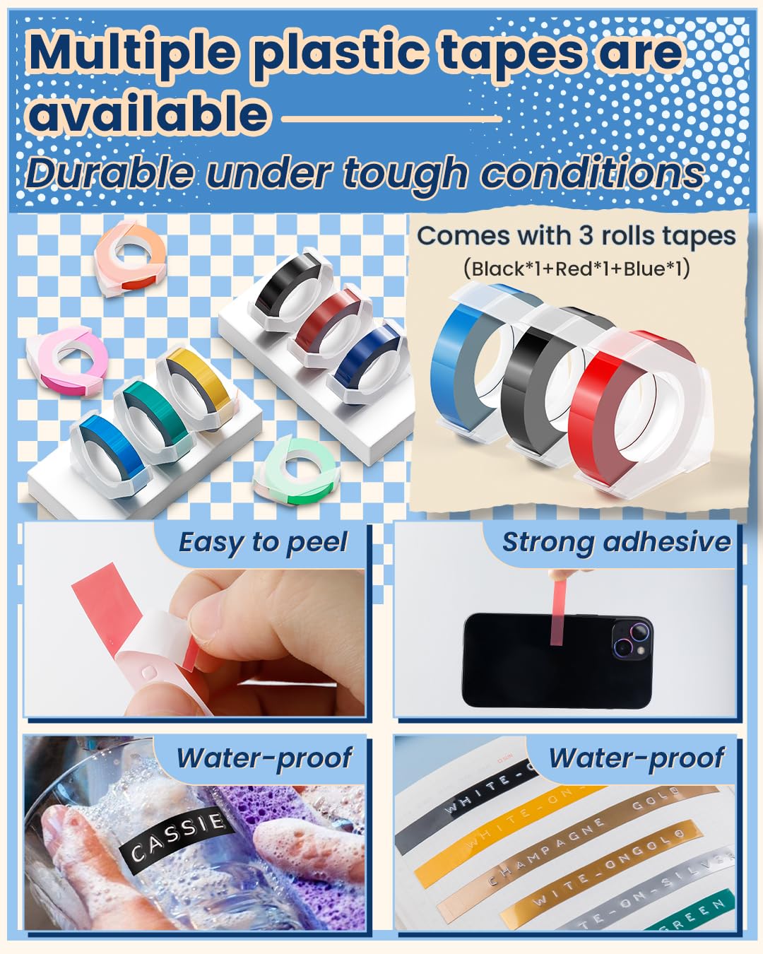 - De reliëflabelmaker wordt geleverd met 3 rollen duurzame 3D reliëflabelband (Zwart*1/Rood*1/Blauw*1), dat waterdicht, oliebestendig, slijtvast, bestand tegen hoge temperaturen, bestand tegen lage temperaturen en niet vervaagt. Het heeft een goede hechting en zelfs als het buiten in de zon en regen wordt geplakt, zal het label niet vervagen of verschuiven.