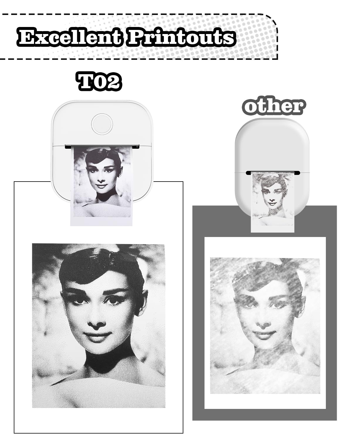 - HD Clear Printing: T02 mini sticker printer receipt printers have a cute look and a small size, specially designed for kids. More importantly, compared with similar mini printer, it has clear printing and high-definition imaging, which protects children's eyes while learning and playing