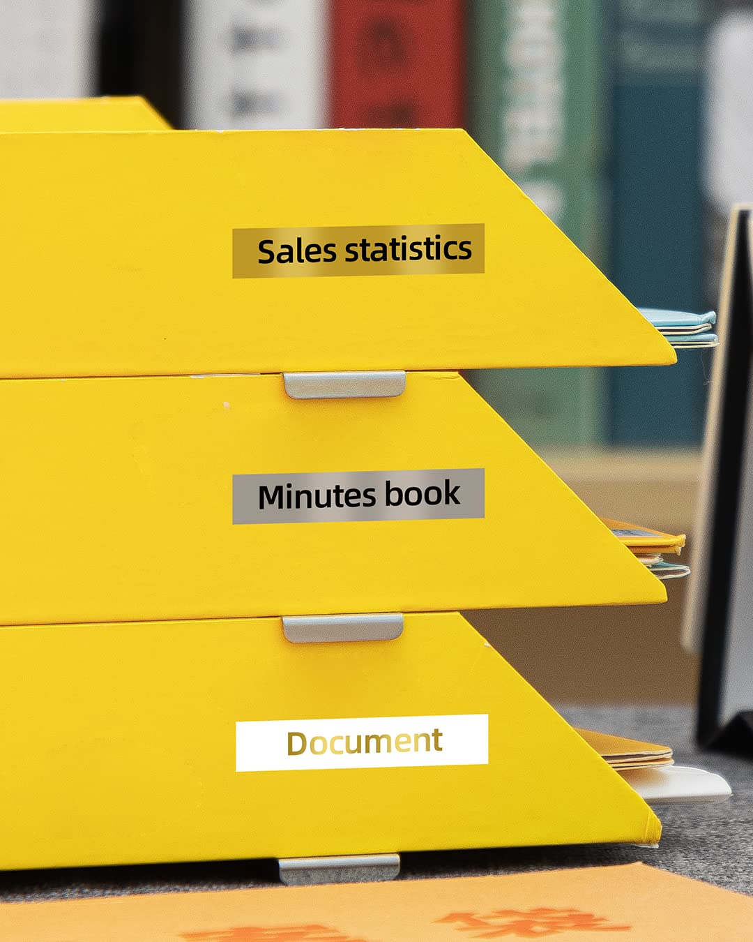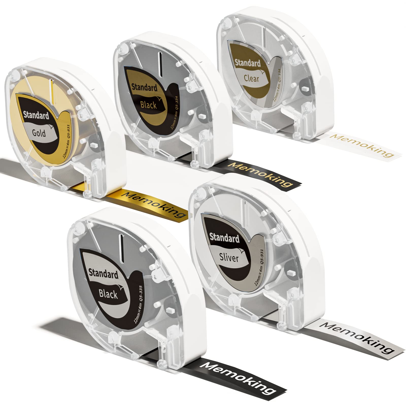 - What you get: 5 Pack durable thermal transfer label tapes, each roll measuring 12 mm(0.47 inch) x 4 m (13 feet). The labels come in black on silver, white on black, gold on black, black on gold, gold on transparent colors and are compatible with Memoking P12 Pro Embossing Label Maker
