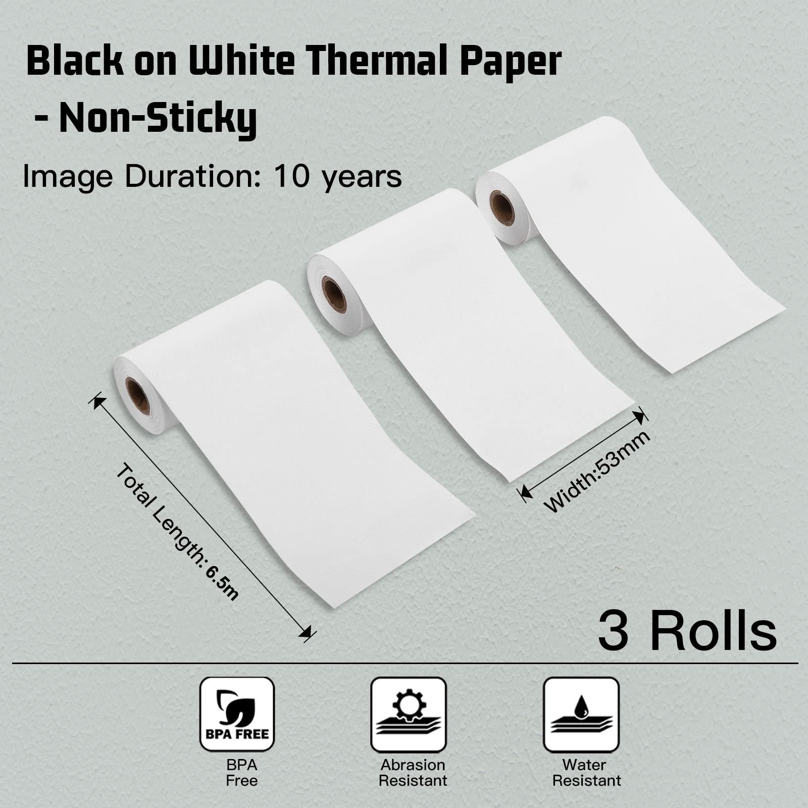 Memoking T02/M02X/M02L Weißes Thermopapier - 10 Jahre nicht klebrig 53mmx6.5m für Journal Fototexte Studiennotizen und mehr, 3 Rollen