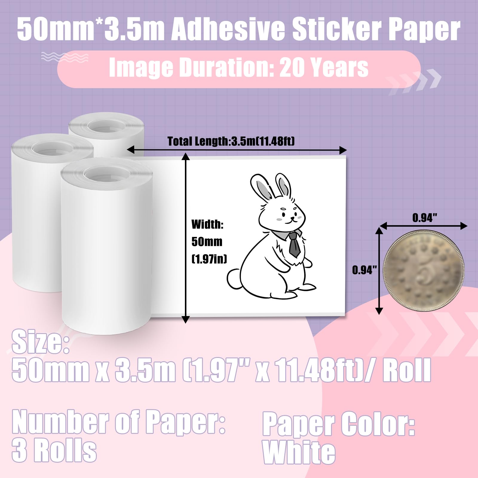 - [Paper Details]White adhesive sticker thermal paper, black text, Each roll width is 50mm(1.97in) , length is 3.5m(11.48ft) , 3 Rolls in box, Image duration: 20 years. (Please note: Keep printer paper away from sunlight and humid environment)