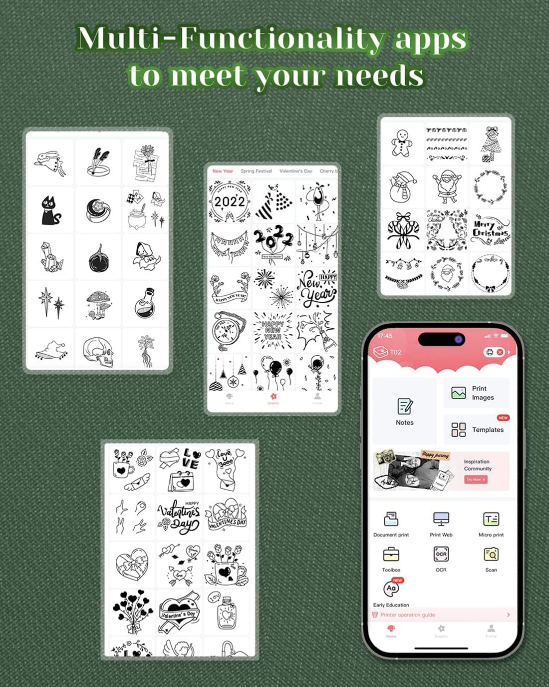 - Mini impresora multifuncional: con la mini pegatina t02, puede imprimir fotos, imágenes, notas de estudio, listas de tareas y personalizar marcadores, etiquetas, revistas y tarjetas de felicitación. Compatible con teléfonos y tabletas Android como iphone, ipad, Samsung y Huawei