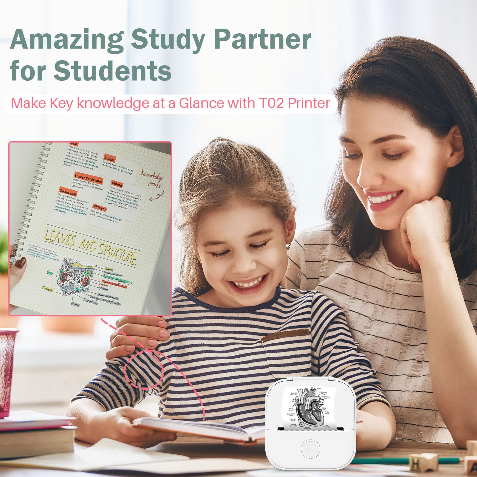 T02 Mini Printer - Bluetooth Inkless Instant Photo Printer, Small Thermal Pocket Sticker Printer, Portable Phone Picture Printer, for Kids Birthday, Children, White