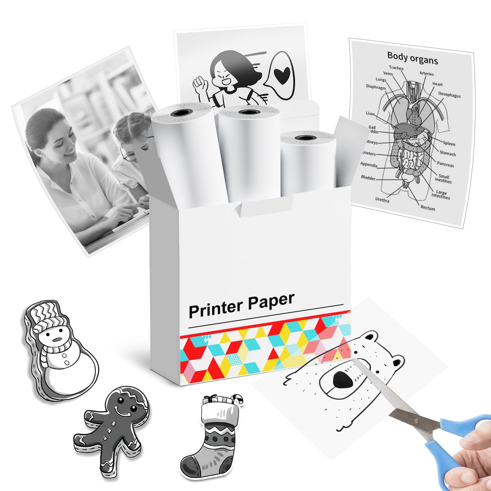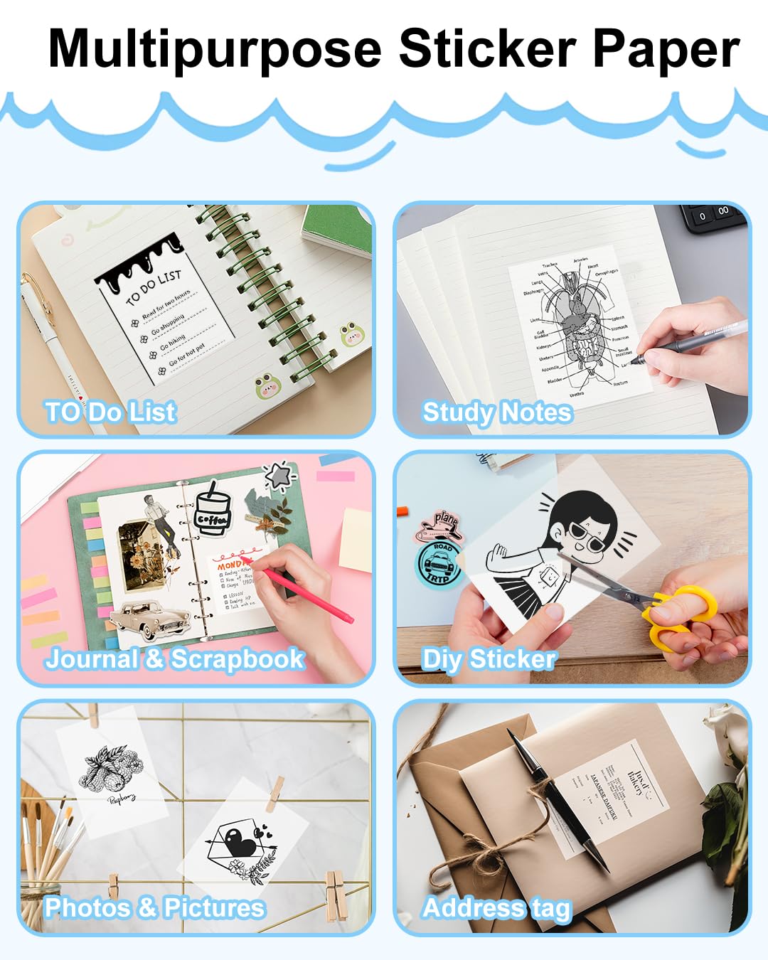 - [Easy to Use]Thermal sticker paper strong adhesion on the back, no glue needed when pasting. With advanced technology, mini printer paper does not leave any annoying residue after peeling off.(Please note: Transparent sticker paper is a thicker material and needs to be cut with scissors. )